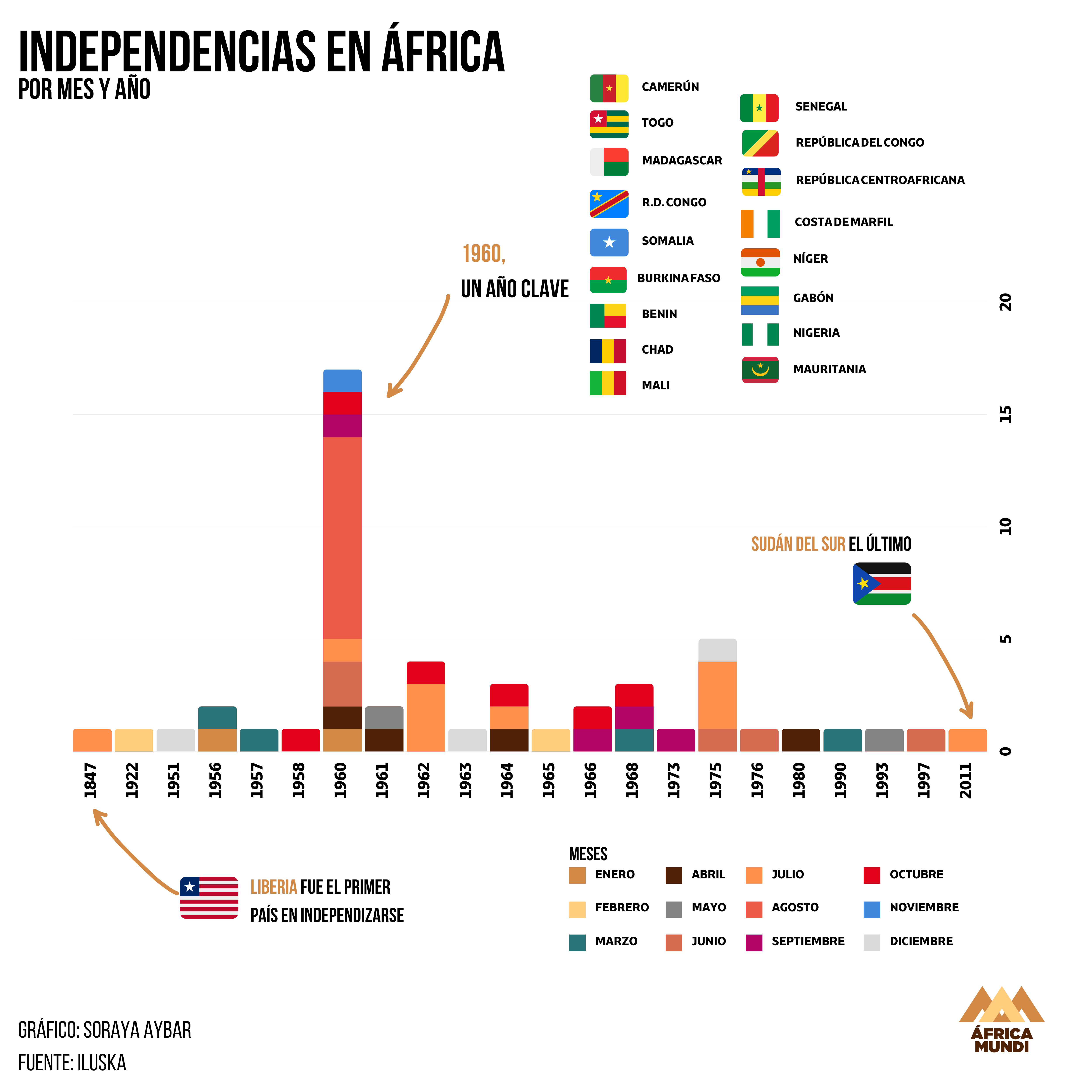 A lo largo de 1960, 17 países sellaron el final del dominio colonial europeo en gran parte del continente africano. Fue un año clave en los procesos de independencia. El 1 de enero de 1960, el Camerún francés inauguró el dominó, y anunció su independencia como República de Camerún durante la presidencia de Ahmadou Ahidjo. Más tarde, en 1984, la parte británica se federó y se adhirió a la escisión francesa. Desde entonces, Camerún vive un conflicto con base en la lengua que ha provocado una de las mayores crisis humanitarias de la región.