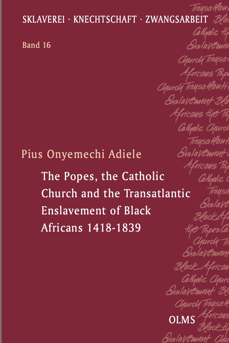 Los Papas, la Iglesia Católica y la Ruta Transatlántica de Esclavitud de Negros Africanos 1418-1839, 2017, Pius Onyemechi Adiele. Este compendio recopila la reacción y posturas de varios pontífices de la Iglesia Católica en la etapa de la esclavitud así como su rol en ella a lo largo de más de 400 años.