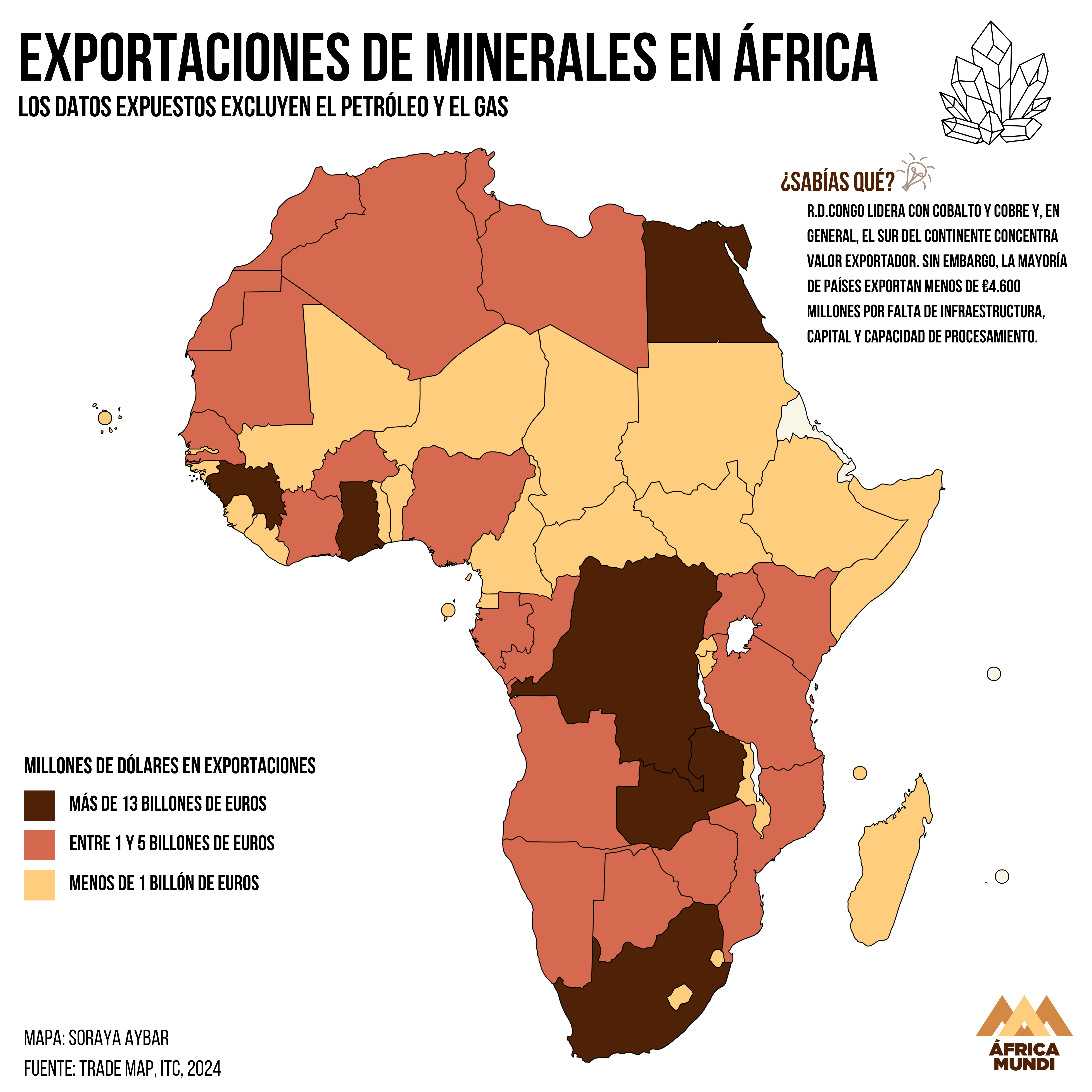 🇨🇩 República Democrática del Congo lidera con cobalto y cobre y, en general, el sur del continente africano concentra el valor exportador.