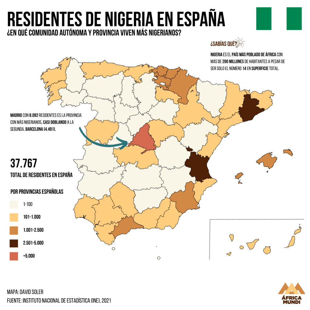 Nigeria tiene más de 200 millones de habitantes, es el país más poblado de África a pesar de ser solo el número 14 en superficie. Eso hace que el país, a pesar de no tener ninguna conexión histórica directa con España, sea el cuarto con mayor número de residentes en España. La gran mayoría se concentra en las tres ciudades más pobladas de España: Madrid, Barcelona y Valencia. Aún así, la capital copa la mayoría de personas, doblando a Barcelona. y sumando uno de cada cinco nigerianos en España.