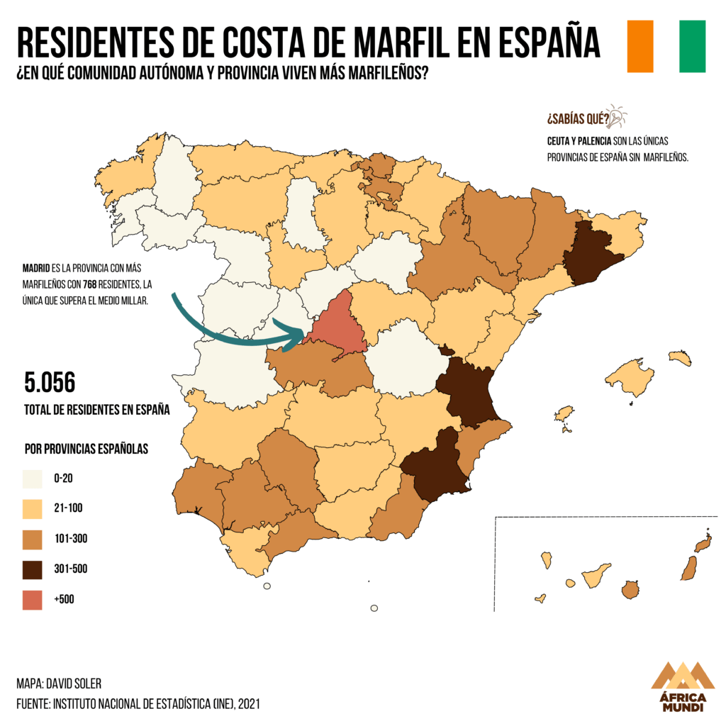 Costa de Marfil es un país que ha estado gran parte del siglo XXI en guerra civil, primero de 2002 a 2007 y más tarde unos meses de 2011 en una segunda que duró poco tras la intervención francesa y de la ONU en favor del actual presidente, Alassane Ouattara.En España hay 5.056 costamarfileños, con la mayoría residiendo en la capital, Madrid. Aún así, en ninguna provincia se supera el millar.