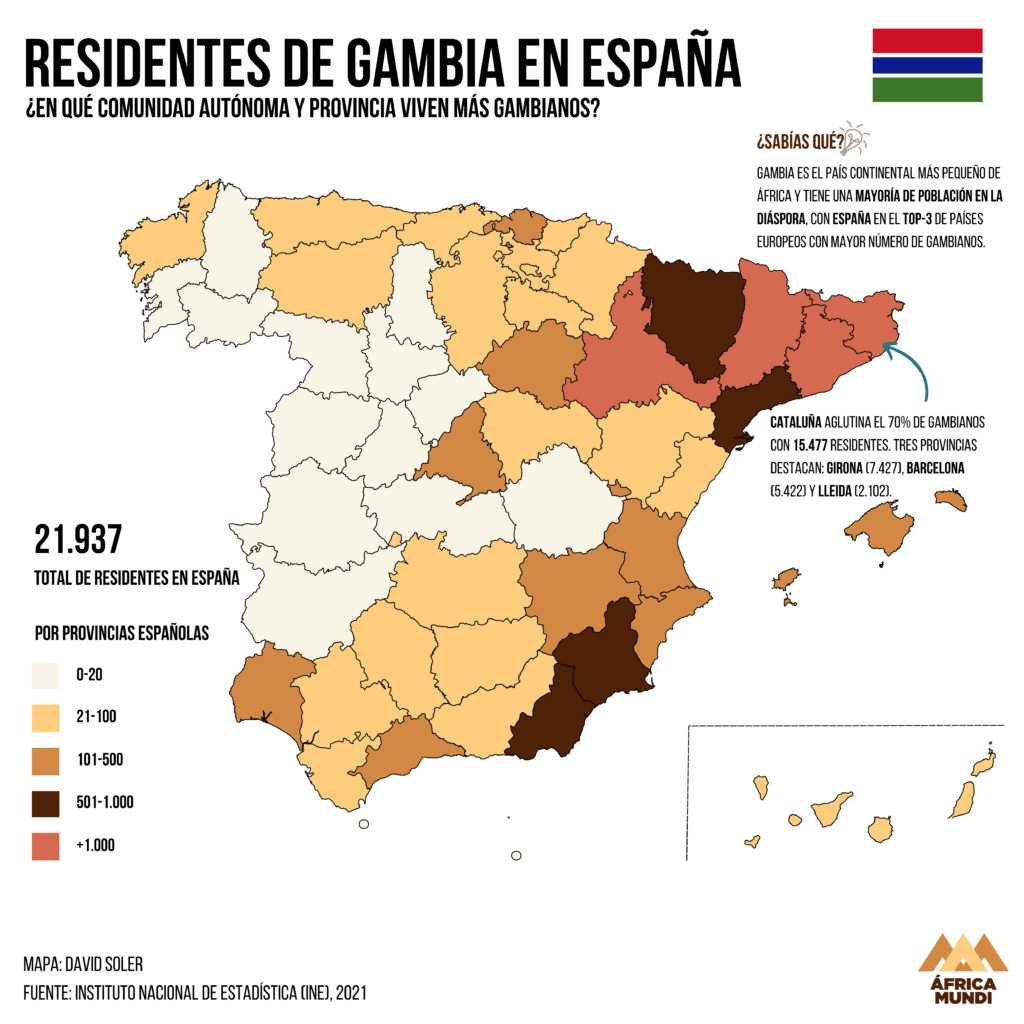 Gambia es el país por tamaño más pequeño de África continental, pero aún así cuenta con una gran diáspora. Gran parte de ella se concentra en la provincia de Cataluña. Esta aglutina el 70% de los 21.937 residentes en España, con 15.477 en Barcelona. En total, España es el país con la cuarta diáspora gambiana más grande.