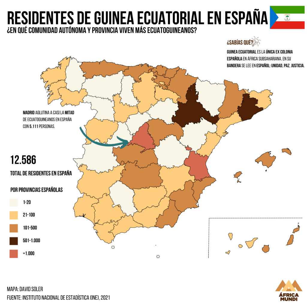 El pequeño país de Guinea Ecuatorial fue la única colonia española en África subsahariana. La presencia española comenzó desde 1778 por el Tratado de El Pardo, pero oficialmente la colonia española comenzó en 1843 y duró hasta 1968, la independencia del país.A pesar de ser colonia, el pequeño país, que se divide en una parte continental y la isla de Bioko, donde está la capital de Malabo, no es ni de lejos la más populosa de España. Las relaciones con el antiguo territorio colonial no se han mantenido en gran medida, pero aún así hay 12.586 personas y es la octava comunidad africana en España. La mayoría se concentra en Madrid, pero Valencia emerge como segunda provincia siendo la única que también cuenta con más de mil ecuatoguineanos.