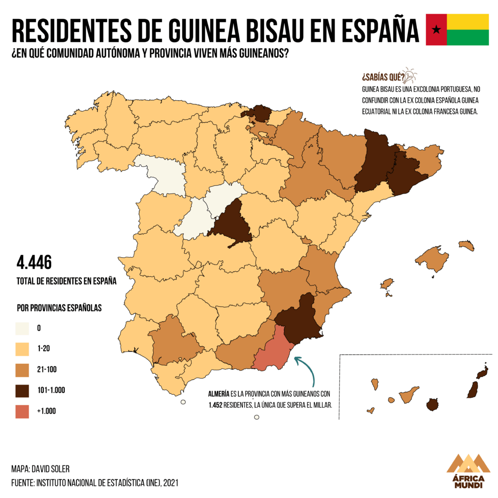 En total en España hay 4.446 residentes guineanos –sí, el gentilicio es el mismo que el de Guinea–. La mayoría se concentra en Almería, donde hay 1.452 residentes.