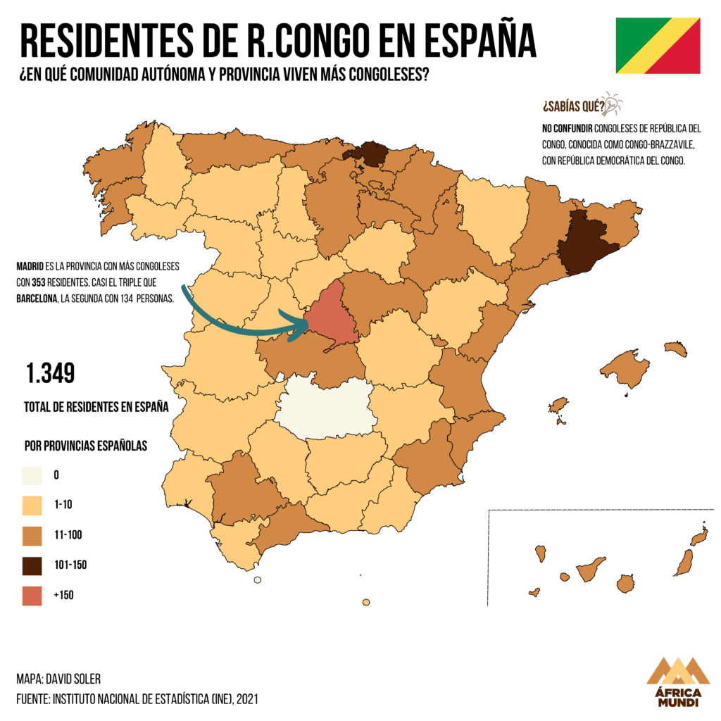 En España hay 1.349 congoleses –también se puede decir congoleños, pero por diferenciar con el siguiente país– con Madrid, Barcelona y Vizcaya como principales provincias, las únicas con más de un centenar de residentes.