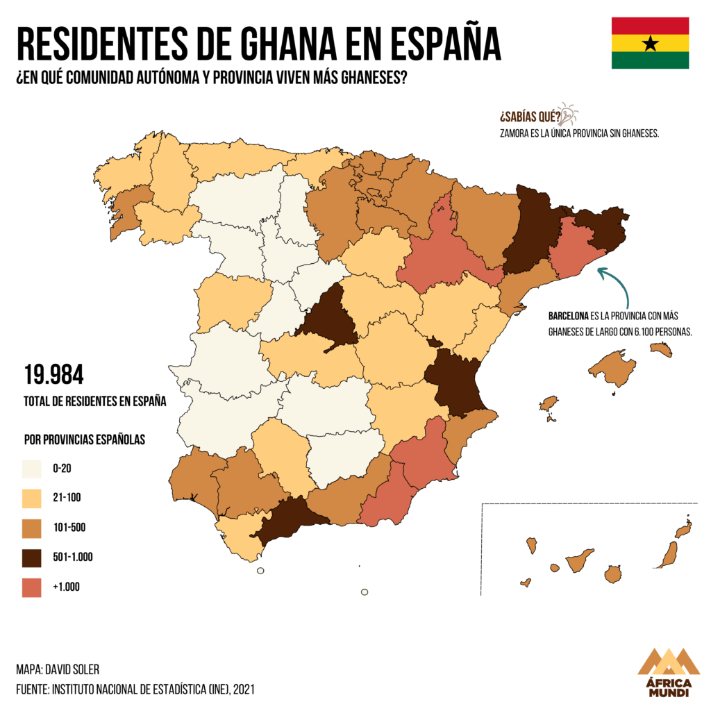 Ghana fue uno de los primeros países que se independizó en la ola de descolonización de la segunda mitad del siglo XX y una de las que más vehemente apostó por un proyecto panamericanista de una África unida sin países separados, al estilo de los Estados Unidos de África. La idea la lideraba su entonces presidente, Kwame Nkrumah, que fue apeado del poder en un golpe de Estado.A día de hoy es uno de los países más estables y democráticos del continente, con alternancia de poder entre dos partidos de manera pacífica. La comunidad ghanesa en España no llega a los 20.000 personas y se distribuye principalmente entre Barcelona, Almería, Zaragoza y Murcia, todas ellas con más de 1.000 personas.