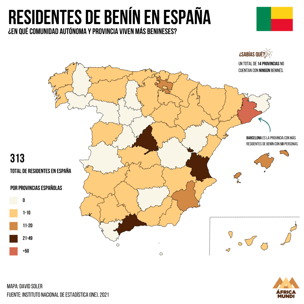 En total residen 313 personas en España, de las cuales 58 se concentra en Barcelona, la única provincia con más de medio centenar de benineses.