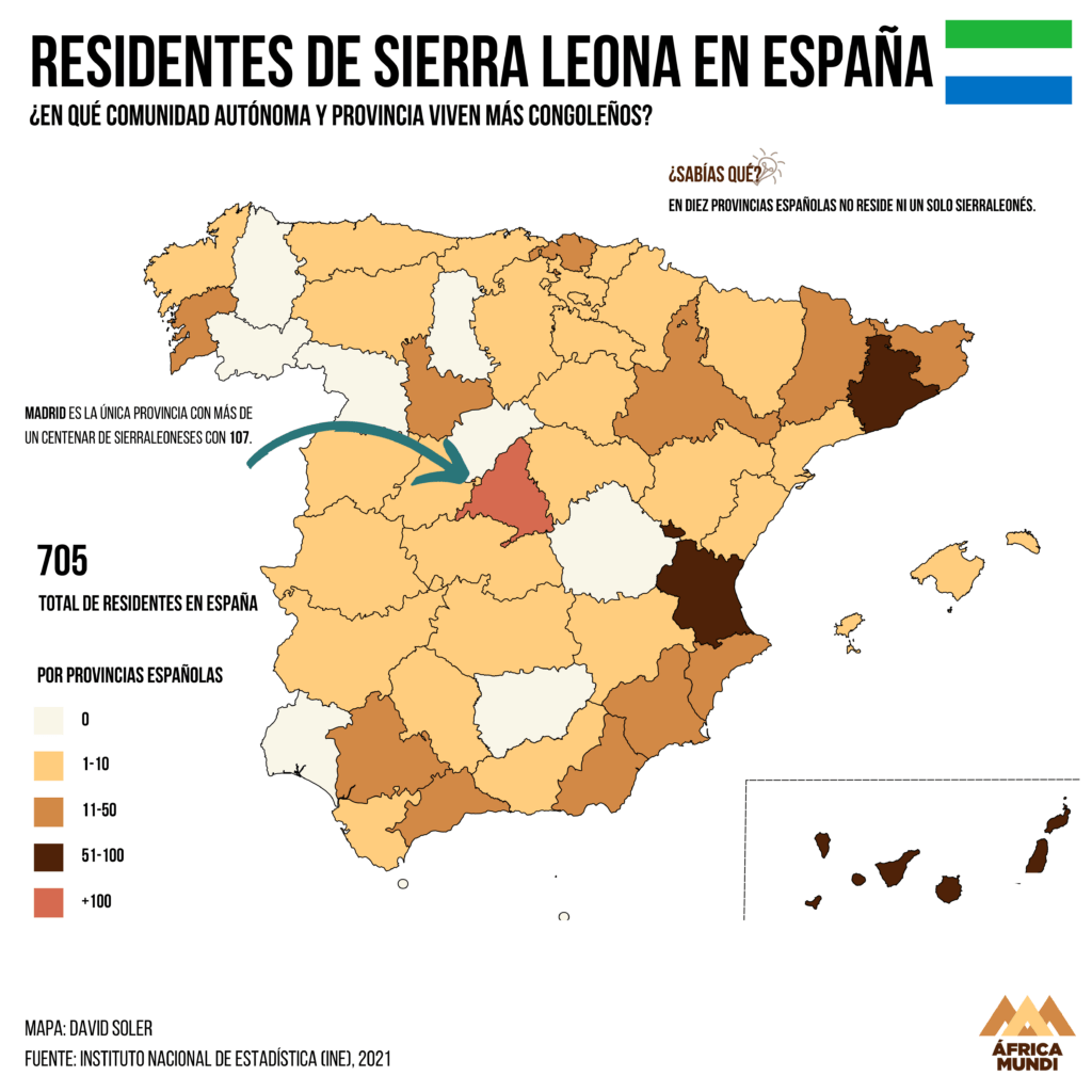 En España hay 705 sierraleoneses. Madrid es la única provincia con más de un centenar. En diez provincias españolas no reside ni un solo sierraleonés. Tal vez una de las personas españolas que más conozca al país es Chema Caballero, que ha trabajado para rehabilitar a niños soldado en el país.