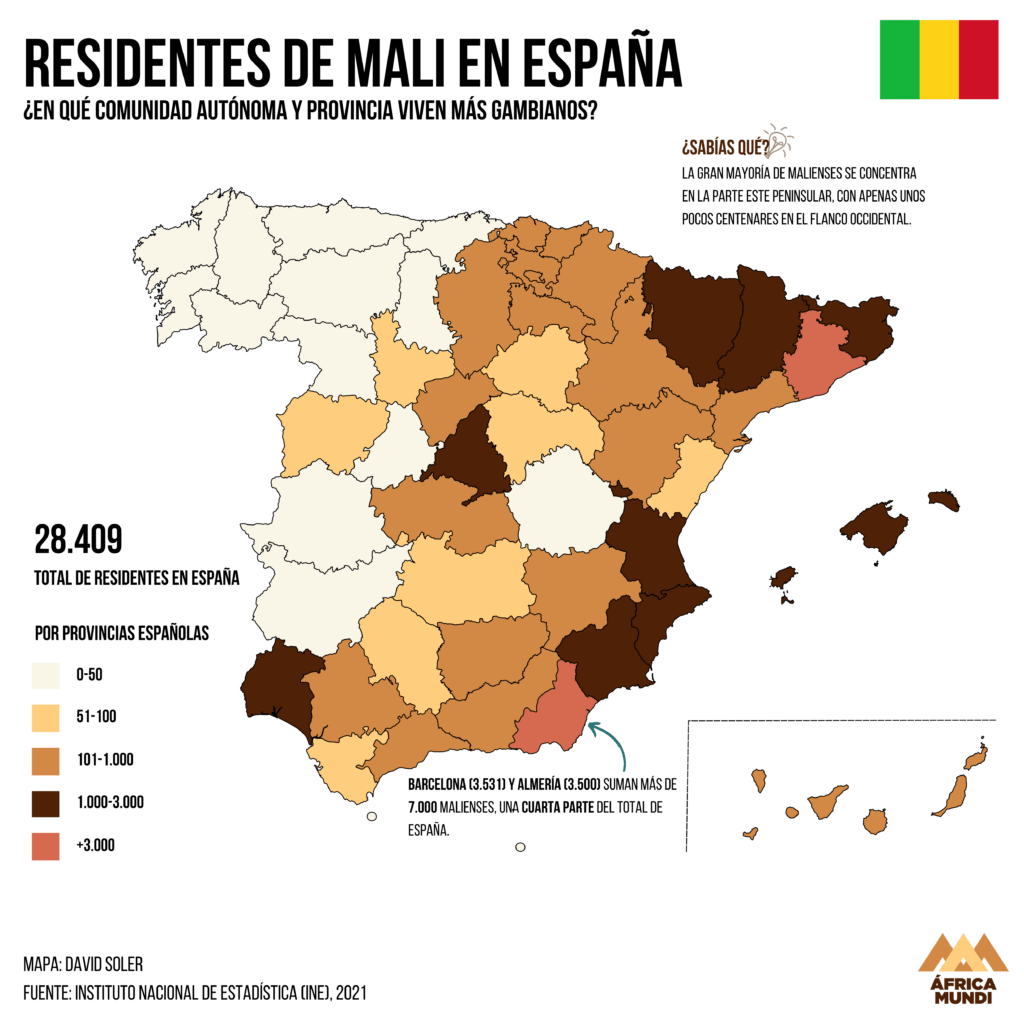 Mali tiene un total de 28.409 residentes en España, la mayoría de los cuales se concentran entre Barcelona y Almería. Así como Almería tiene tilde, Mali no, aunque sea oficialmente aceptado según el diccionario español.