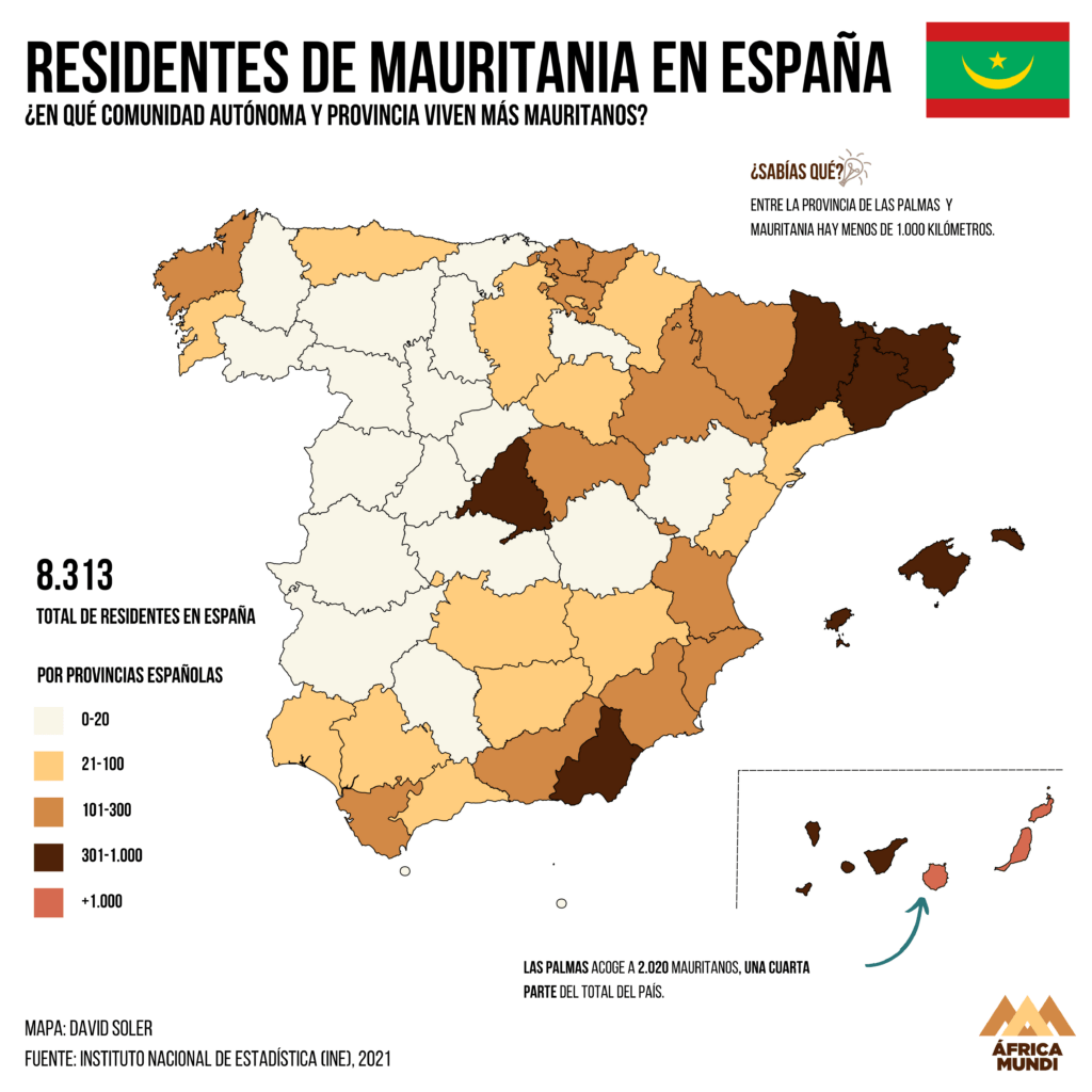 En total en el país hay 8.313 residentes mauritanos y la mayoría, una cuarta parte del total, están en Las Palmas de Gran Canaria, la provincia geográficamente más cercana al país.