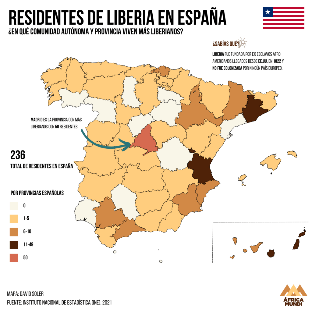 El último de la lista de países que el Instituto Nacional de Estadística recoge por población es Liberia, con tan solo 236 personas recogidas en el censo. La gran mayoría se concentra en Madrid, que tiene 50 residentes, y en nueve provincias no verás ni un liberiano.